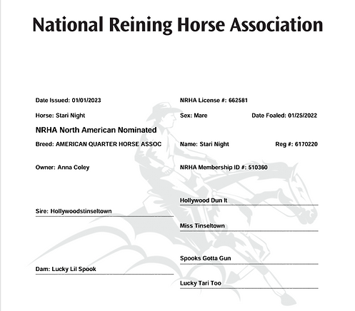 Stari Night is a 3yo mare by HollywoodsTinseltown (LTE $179,000 PE $3 Million) and out of a daughter of Spooks Gotta Gun (LTE $81,000, PE $3.6 Million). She is double registered AQHA and APHA, a great outcross for cowhorse, and is 7 panel N/N.